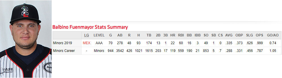 Fuenmayor is en fuego (on fire) in Mexico and is clearly back to his slugging ways. Playing half his games in Laredo – a ballpark not subject to the performance-enhancing altitude of most Mexican League parks – Balbino has mashed 22 ding dongs in half a shortened season. Not bad at all.