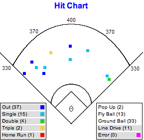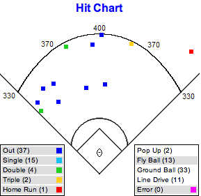 Linedrive Observation: Same old story. Notice the clump in LF; I imagine OF positioned him in this fashion, thus only the 50% success rate near the LF line.