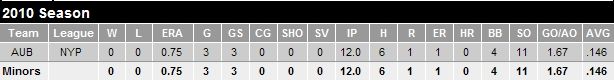 Like Syndergaard, Asher Wojciechowski was drafted this year in the sandwich round and signed quickly. Signed out of the well-respected college baseball program of The Citadel, Wojciechowski is further advanced and was assigned to single-A Auburn. The Blue Jays view him as a “bulldog-like” starting pitcher. Since he was a closer, he is being stretched out by starting games but only going 3-4 innings. Regardless, he has been putting up stellar numbers by relying on his fastball that tops out at 94mph with good downward plane and a slider that projects as above average. He does have a changeup that is not yet playable but he is working on it as a 3rd pitch.
