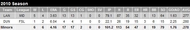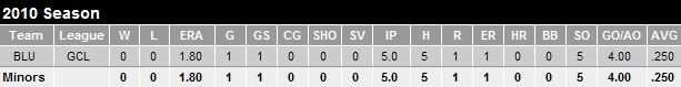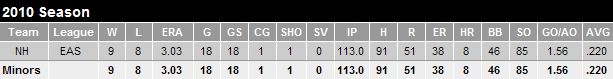 Coming into camp 25 pounds slimmer due to an offseason diet and training regimen, Jenkins was assigned to Lansing to begin the 2010 season. It was anticipated that Jenkins would dominate the younger competition at class-A ball. Although he didn’t dominate, he pitched well – well enough to garner a promotion to Dunedin. He had excellent control, walking only 13 hitters in his 13 starts, although opposing batters did hit at a high .277 clip. He’s brought his low 90’s fastball and the makings of a plus slider to Dunedin but has struggled since his call-up, which is no surprise when looking at his periphery numbers. When he becomes more consistent with his slider, he will be able to turn in more starts like he did against Clearwater two weeks ago: 7IP, 5K 5H 1ER and 13 groundball outs.