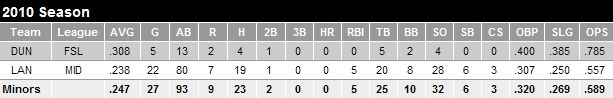 Brett Wallace is pretty much major-league ready when it comes to the bat, but as Matthias saw when he was in Vegas, he still has to work on the defensive nuances of the first baseman position. Jays GM Alex Anthopoulos has publicly stated Wallace will spend the entire season at the AAA level to get that defensive experience. Expect to see him up with the big club in 2011 when Overbay departs. For a look at Wallace in spring training, click here.