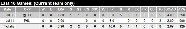 Farquhar, who throws his pitches from multiple arm angles, has struggled to find consistency with his mechanics and as a result his control has suffered. He’s still good for a strikeout per inning but his walk total is unacceptably high. However, take a way a few appearances where he has imploded and he has been a more than capable reliever.