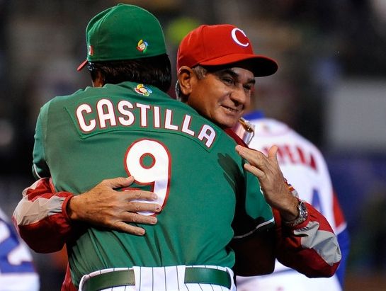 Higinio Velez embraces Vinny Castilla at the World Baseball Classic